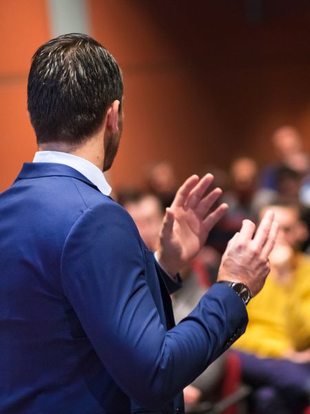 Un maestro de ceremonias es un profesional con experiencia y habilidades especializadas en la gestión y supervisión de todos los aspectos de tu evento corporativo. Se encarga de: